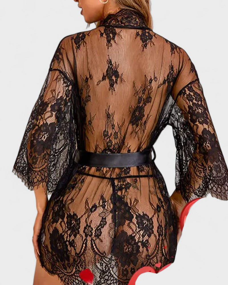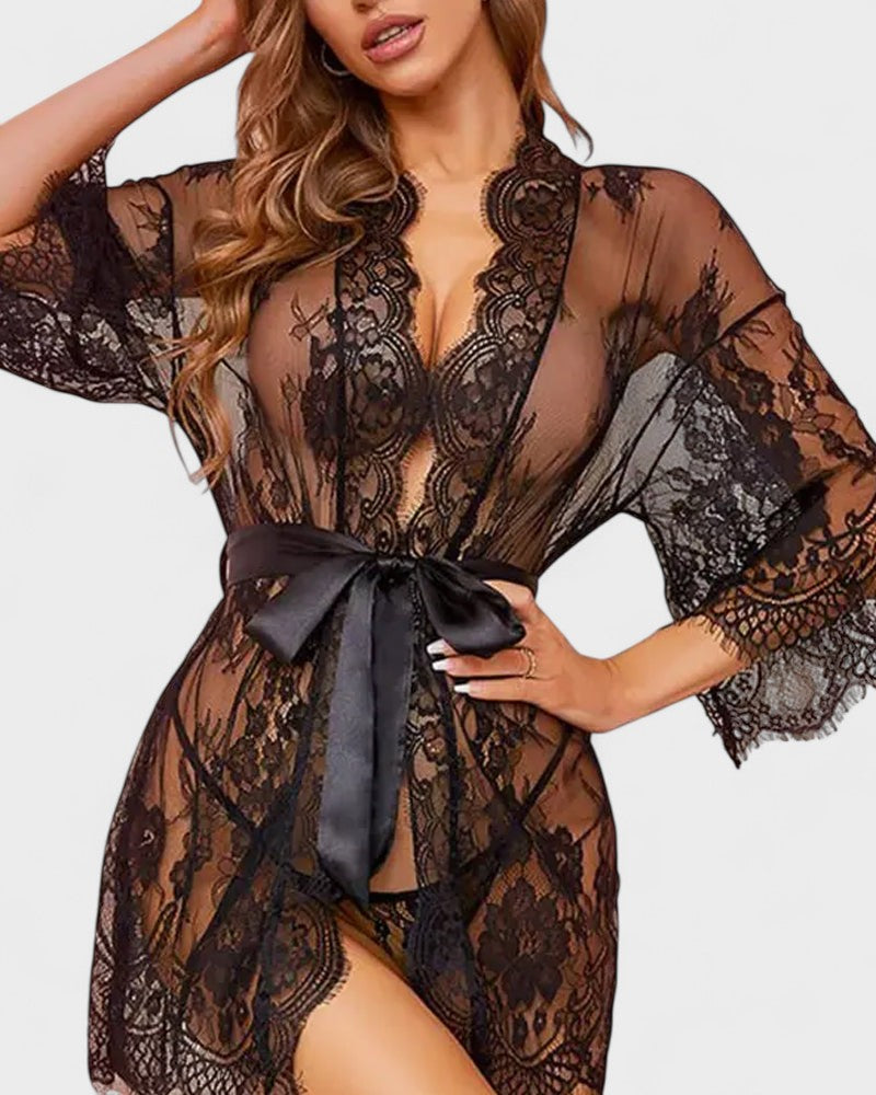 חלוק יוקרתי המשלב תחרה עדינה ושקופה עם גזרה מעודנת. בזכות השרוולים הרחבים וחגורת הסטן הוא מתאימה בקלות לדמות ומקנה מראה חושני ואלגנטי בו זמנית. הקישוט העשיר בתחרה מדגיש את הנשיות ועושה את המודל הזה לחלק שאין לעמוד בפניו לרגעים מיוחדים וגם לערבים רומנטיים.