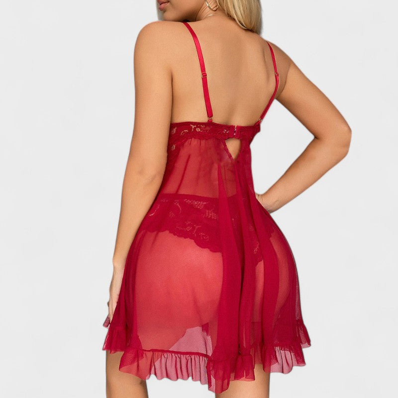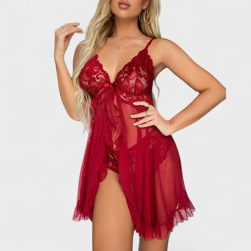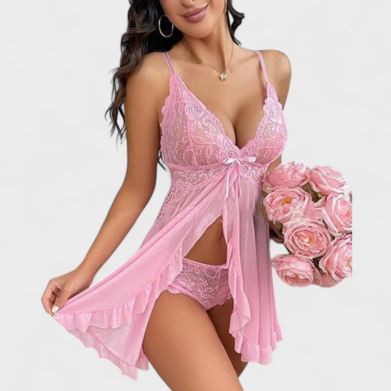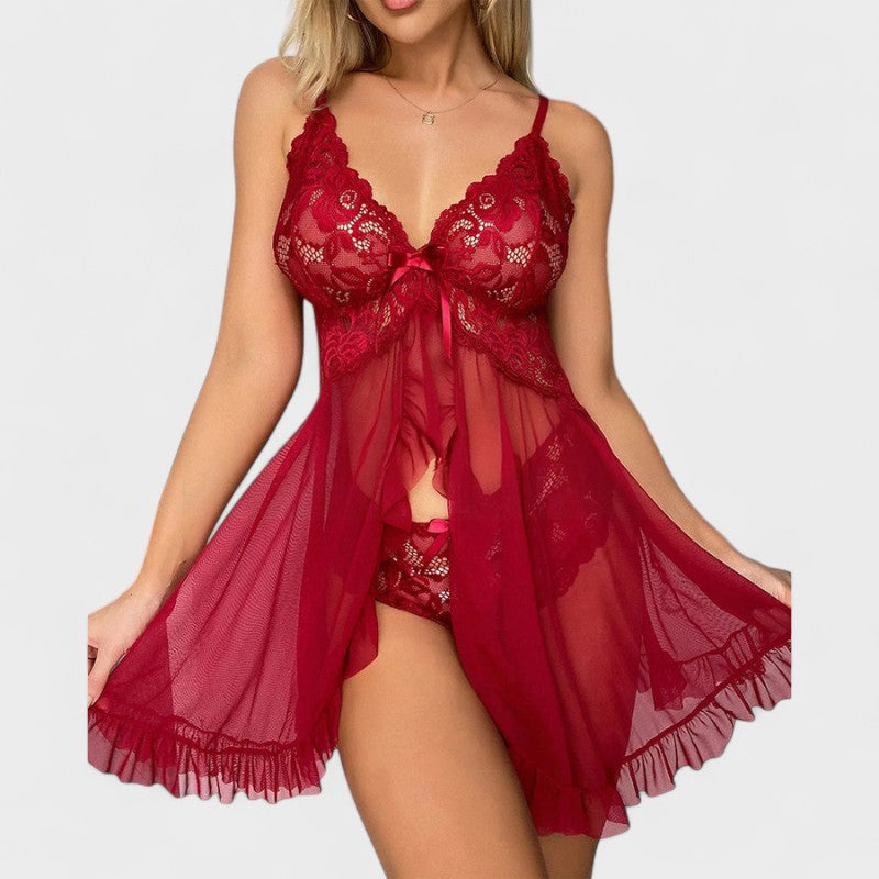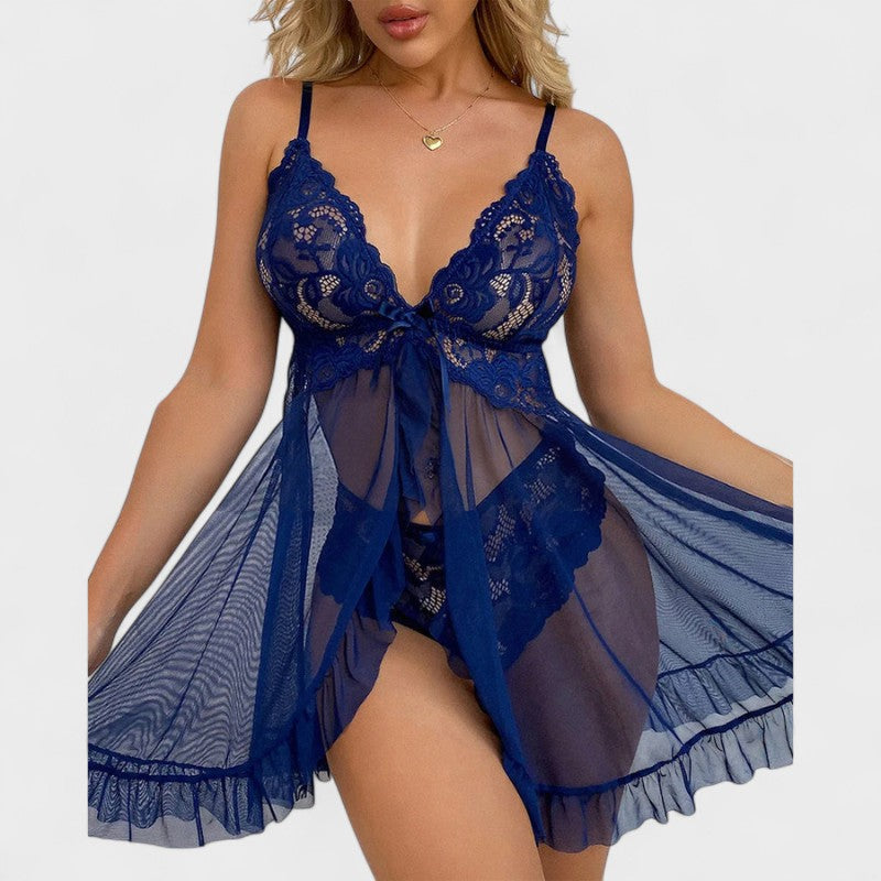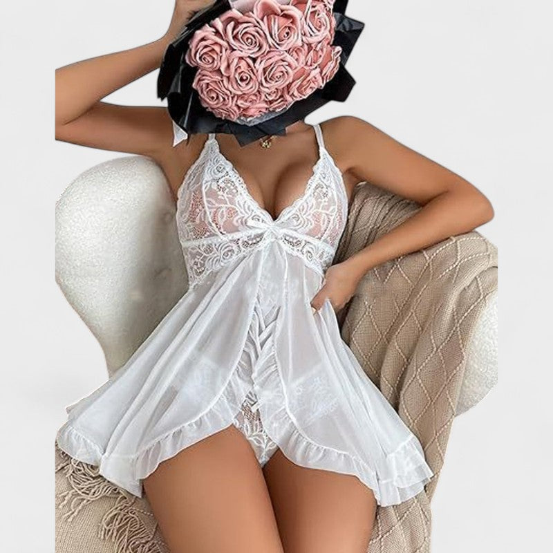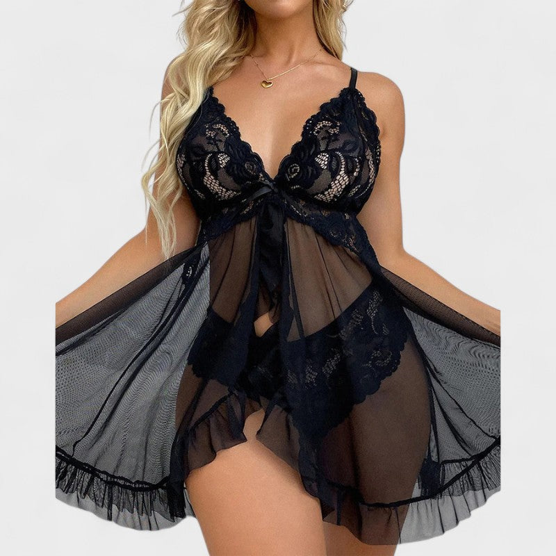 סט מקסים שמחבר בין תחרה עדינה לבין חומר קל שקוף. החולצה עם רצועות מתכווננות וקשירה מתחת לחזה מדגישה בצורה מושלמת את המחשוף, בעוד שפרטי התוספות נותנים נופך משחקי ורומנטי. חלק מהסט כולל גם תחתונים תואמים מתחרה, שמוסיפים למראה הסקסי הכולל.